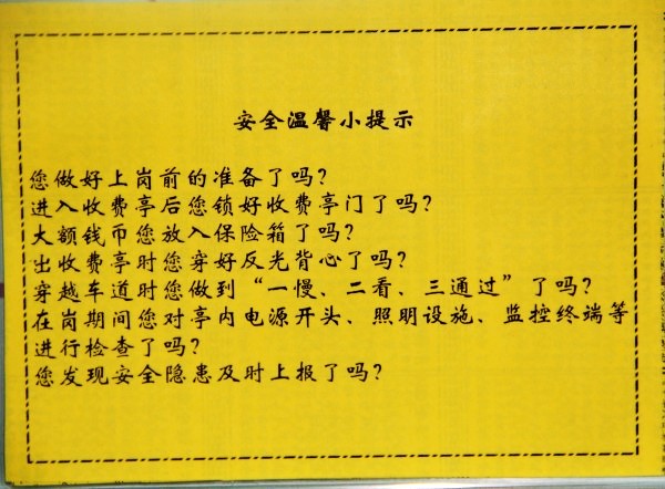 該站首先召開了專題會,精心組織,周密安排,營造濃厚的“安全生產(chǎn)月”活動氛圍;其次是形式多樣,務(wù)求實效。利用安全知識、安全提示卡、安全知識小測試等形式,普及安全生產(chǎn)常識。三是做好安全生產(chǎn)隱患自查自改工作。站安全領(lǐng)導(dǎo)小組集中對站內(nèi)的收費、鍋爐、機(jī)電設(shè)施等重點區(qū)域進(jìn)行了安全排查,針對發(fā)現(xiàn)的問題進(jìn)行了整改。四是深化班組長在崗期間安全生產(chǎn)負(fù)責(zé)制。強化班組安全檢查制,每天由班組負(fù)責(zé)上崗期間收費亭、收費廣場的安全檢查,填寫《崗上安全巡查記錄》,做到了安全工作與業(yè)務(wù)工作的有效結(jié)合。(宣化東收費站 王輝)