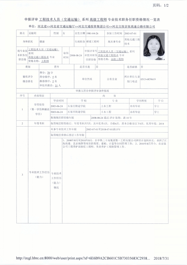 京張公司2018年度專業(yè)技術(shù)職稱申報公示(吳銀利)